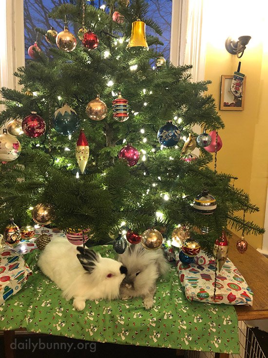 Thanks, Deb, kc, Jac, and bunnies Bubbles and Harlow! Deb writes, “Harlow and Bubbles love the Christmas tree. They also like to kiss under it.”