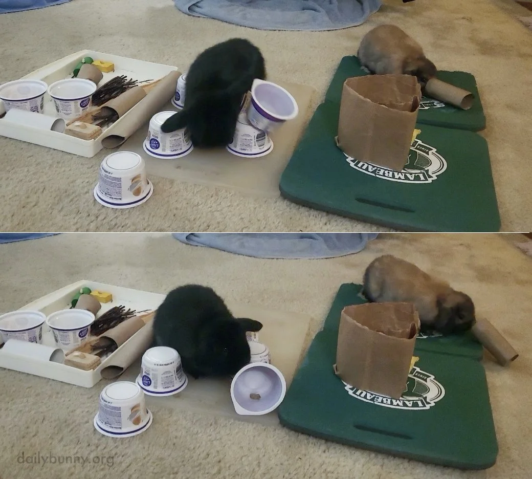 Happy Bunday! Thanks, Jordana and bunnies Bun-Bun and Puffet! Jordana writes, “Here are Bun-bun and Puffet toppling cups, tipping up tubes and otherwise enjoying their bunny foraging playground!”