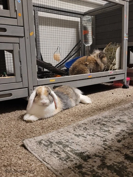 Well, still not bff's yet. They still lie close to each others hutch when out. They will eat hay together sometimes and will sniff at one another through the hutch grate and not jump at each other like they used to. Here is TT staying close to Nuggets hutch. TT has grown SO much! It's been fun and interesting being a family with two buns.