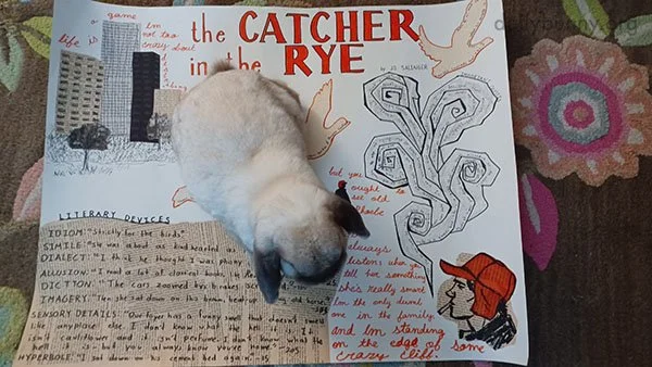 Thanks, LilaEve and bunny Chester! LilaEve writes, “Chester is inspecting my work in these pictures. He was very interested in the whole poster making process and especially enjoyed nibbling the newspaper.”