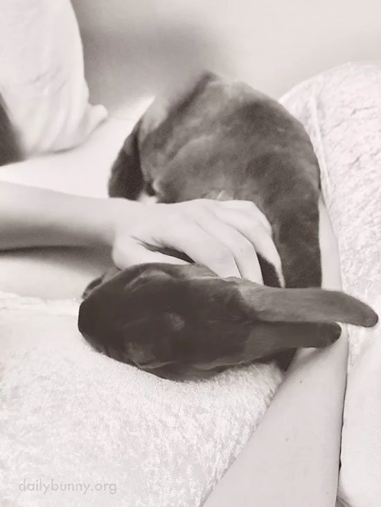 Thanks, Mila and bunny Meiling! Mila writes, "Every night Meiling hops on the bed when she is ready for night time snuggles, takes a brief nap and then gives a long session of farewell licks and kisses before returning back to hang out with Momo!”