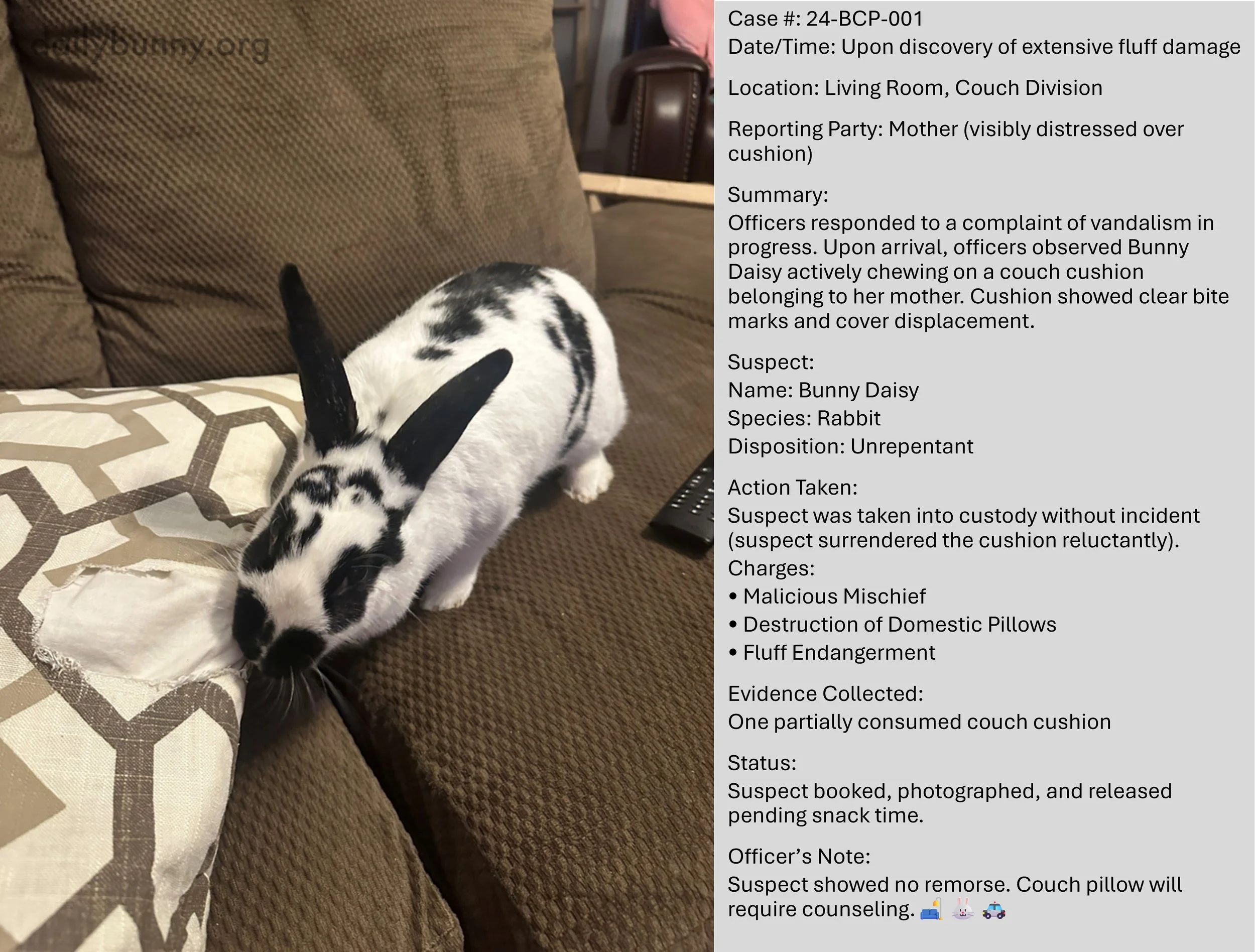 Thanks, David, Valerie, and bunny Daisy! David writes, “All Points Bulletin – Be on the lookout for a Black and White, suspected of Malicious Mischief…”